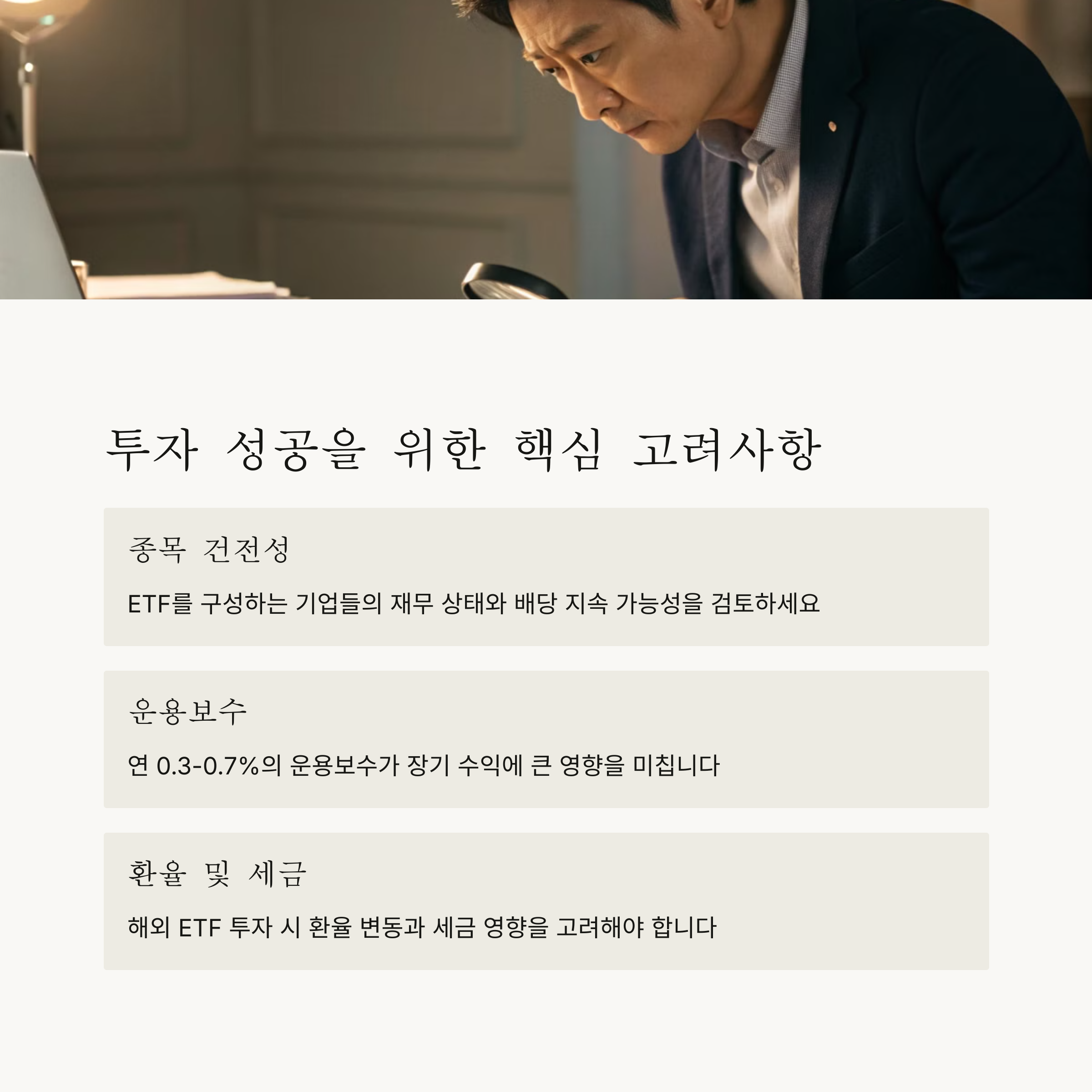 그러나 고배당 ETF의 단점이나 리스크도 분명 존재합니다. 첫째, 배당 수익률이 높다고 해도 기초 자산의 주가가 하락할 경우 전체 수익률은 감소할 수 있습니다. 둘째, 분배금을 재투자하지 않는 경우 복리 효과를 누릴 수 없어 장기 수익률이 제한적입니다. 셋째, 운용보수(수수료)가 높은 ETF는 장기 보유 시 큰 부담으로 작용할 수 있습니다. 넷째, 해외 ETF의 경우 15% 배당 원천징수세 및 환율 변동 리스크도 무시할 수 없습니다. 따라서 장기 보유를 계획하고 있다면 이러한 요소들을 모두 고려한 전략이 필요합니다.