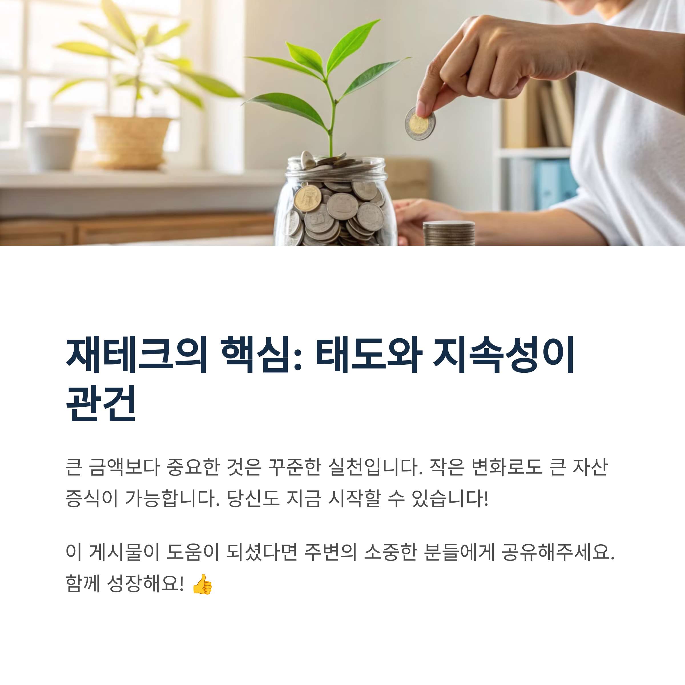 재테크는 특별한 사람만의 전유물이 아닙니다. 습관, 전략, 반복, 실천, 그리고 시간. 이 다섯 가지를 기억하세요. 다양한 사례를 통해 확인했듯이 돈보다 태도가 먼저 바뀔 때 자산도 따라옵니다. 오늘 당신의 작은 실천이 내일의 자산을 만들어낼 수 있습니다.