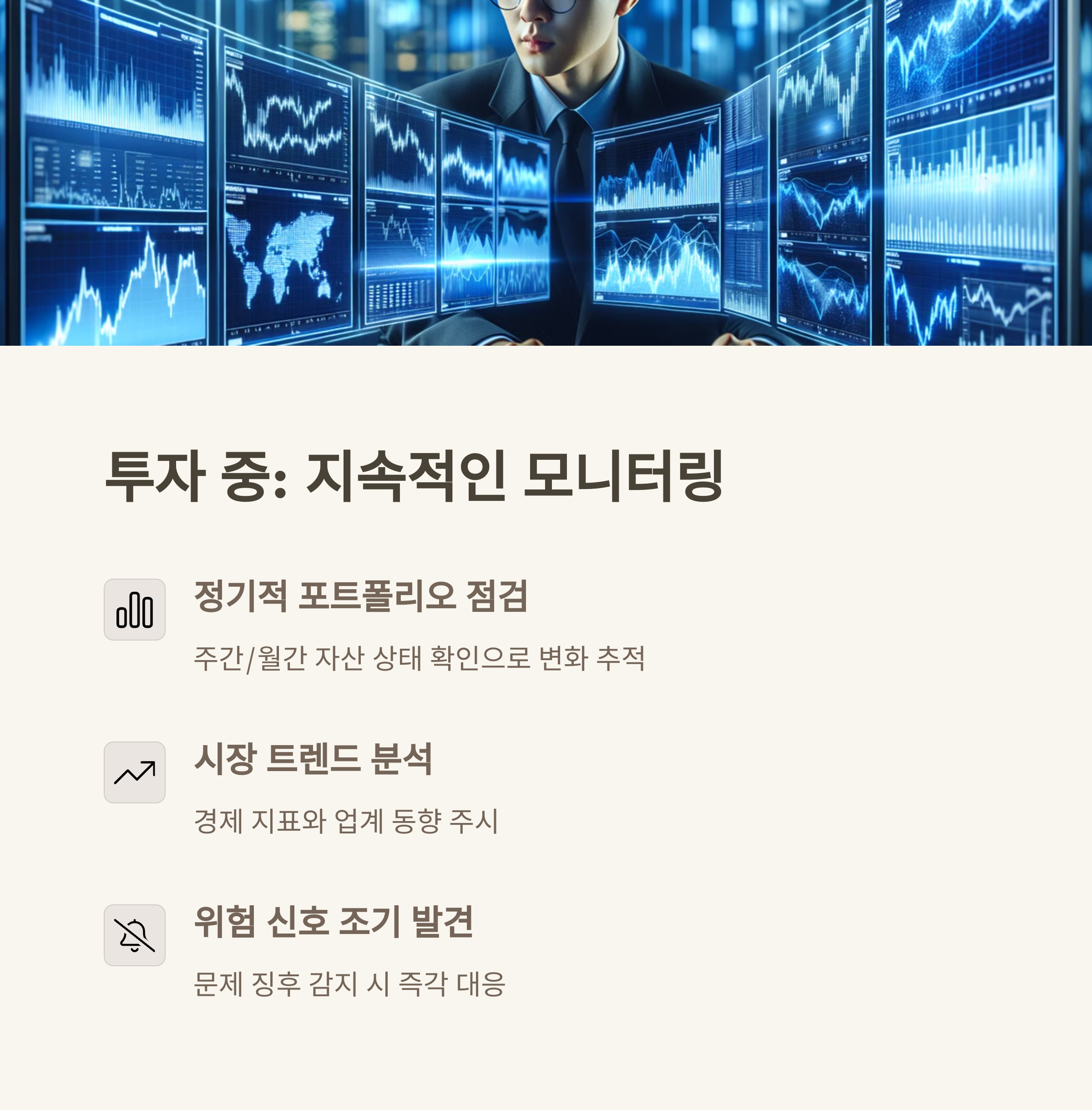 | 목표수익률 설정, 리스크 진단, 포트폴리오 구성 체크 | 월간 자산 점검, 외부 이슈 반영, 매수매도 전략 수정 | 리포트 작성, 실수 복기, 전략 리뉴얼 |