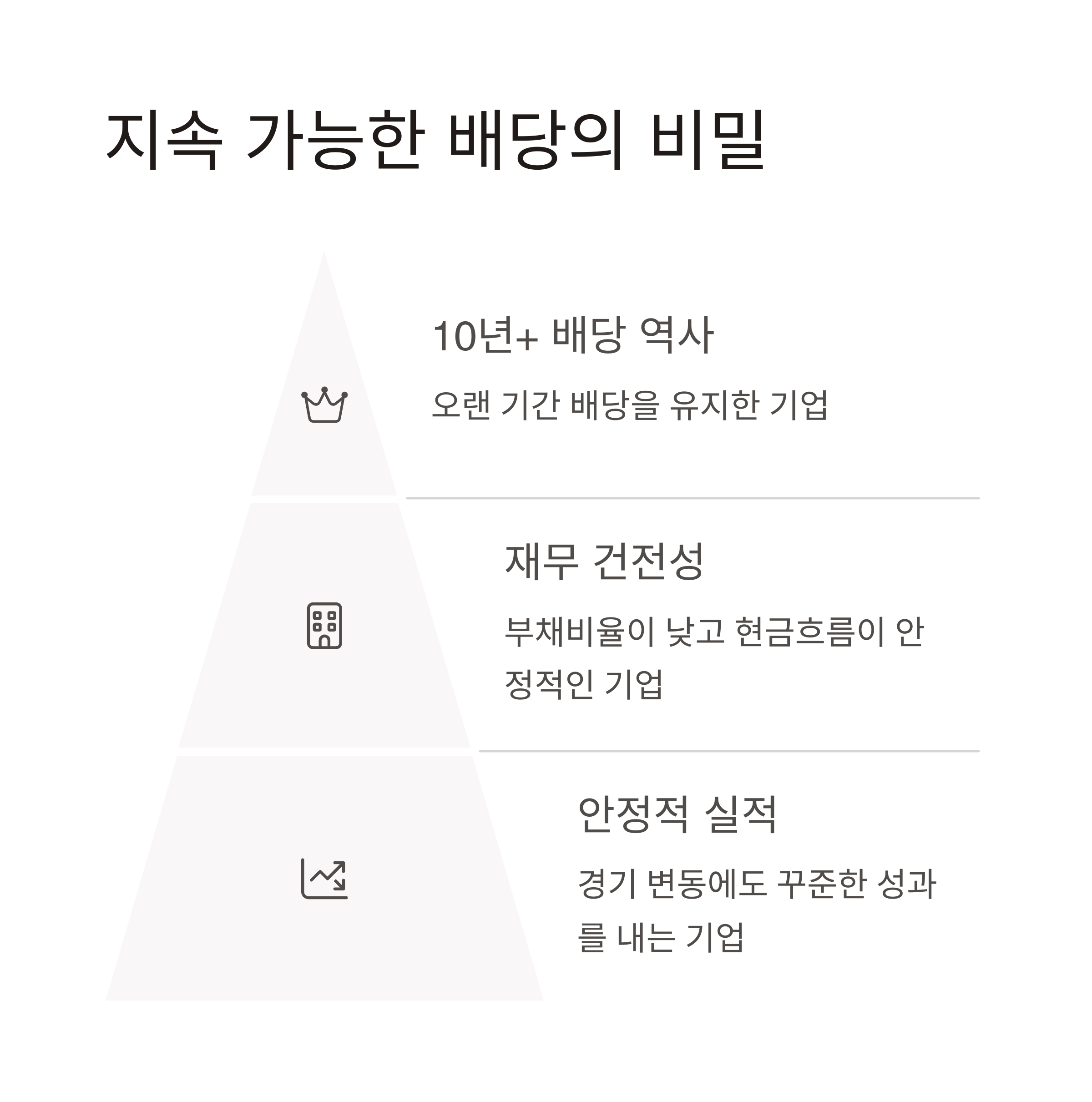 | 안정적인 배당을 장기간 유지하는 기업이 핵심 | 다양한 산업군에 투자해 리스크를 줄임 | 배당금 재투자로 장기 복리 효과 실현 가능 |