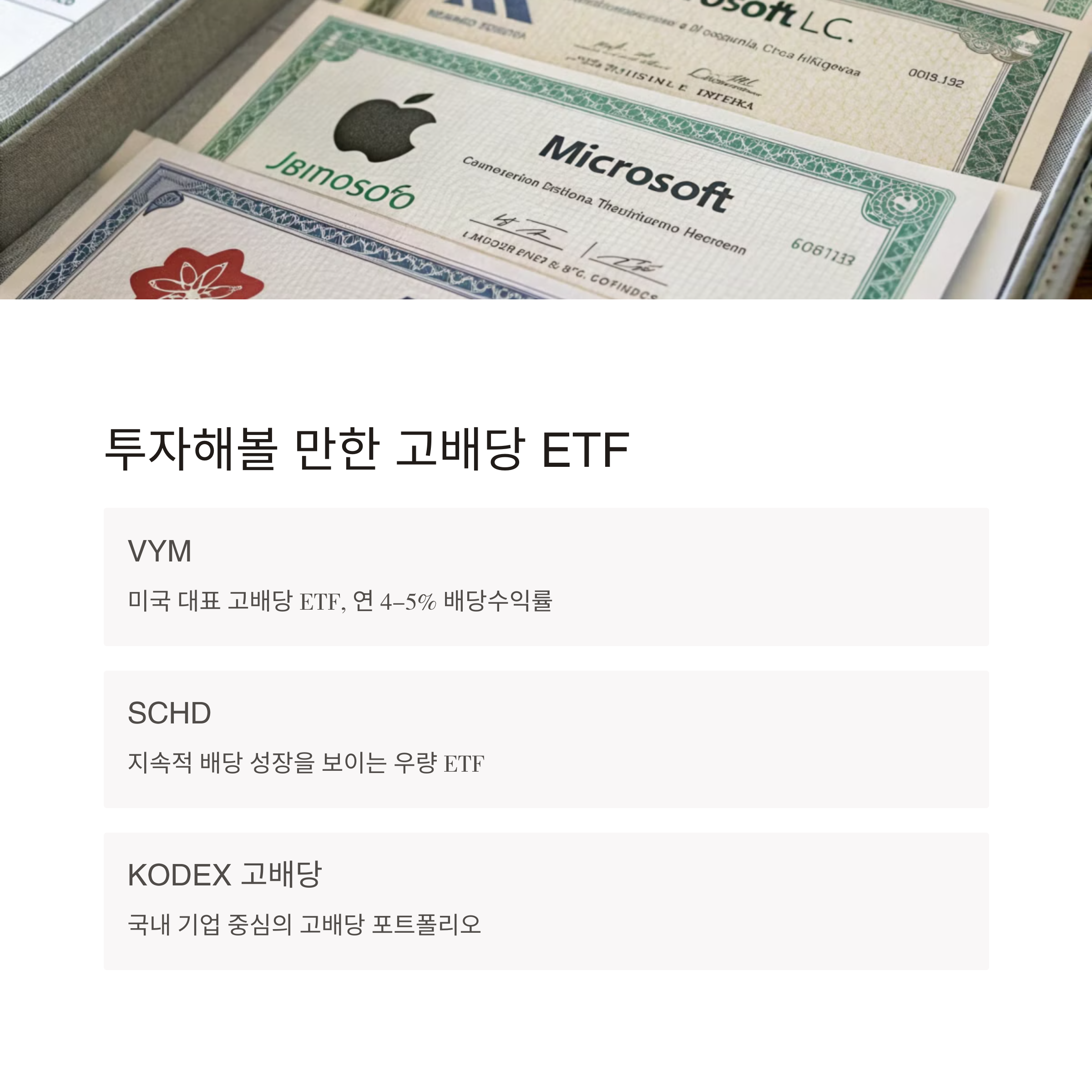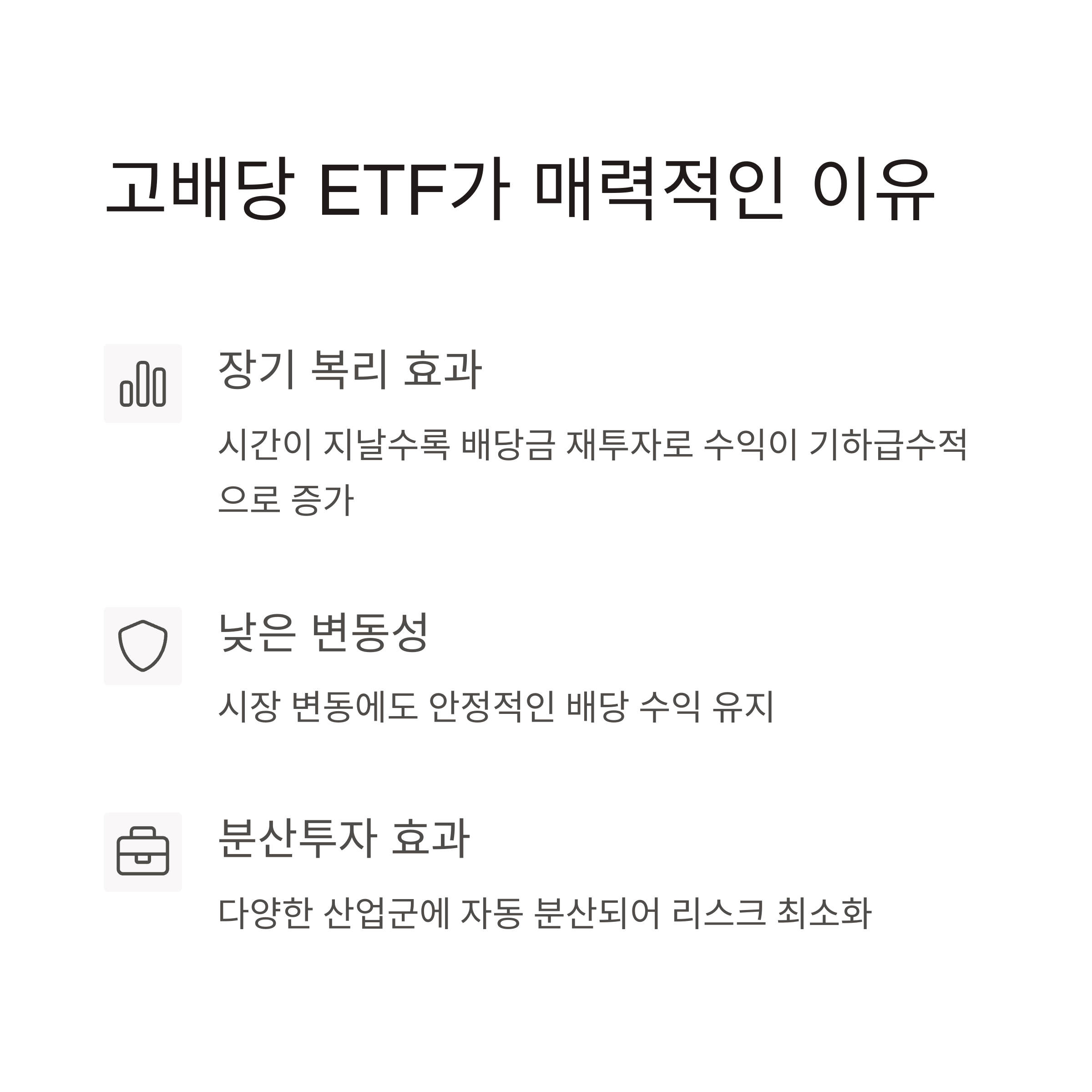 | 고배당 ETF 장점 | 안정적 수익과 분산 투자 효과 제공 |