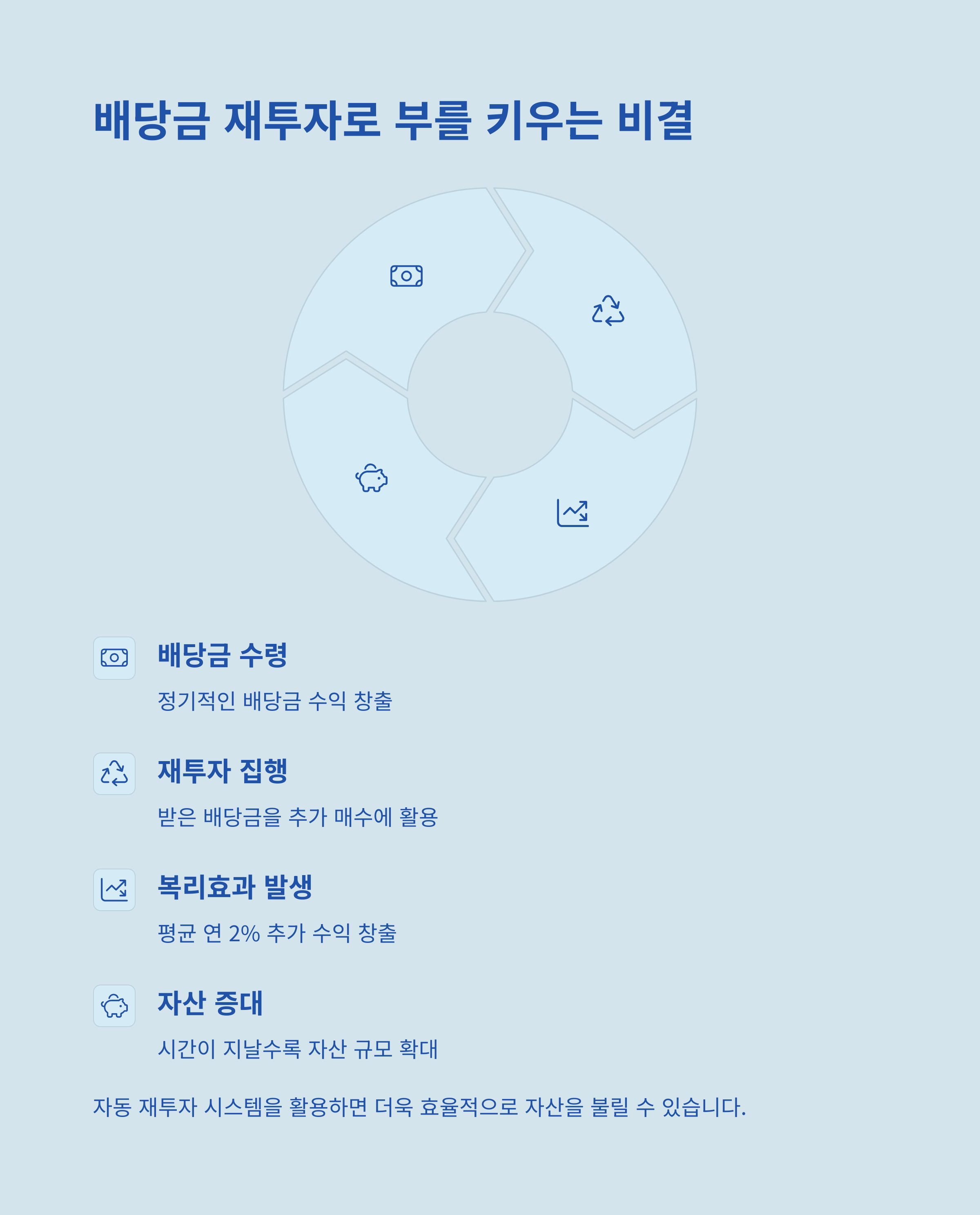 고배당 ETF를 통한 자산 증식을 원한다면 일반계좌: 국내 ETF 중심, ISA 계좌: 국내/해외 혼합, 연금저축/IRP: 장기투자형 ETF로 구분하는 것이 좋습니다. 특히 연금계좌에서 배당을 받으면 세금 없이 누적되기 때문에 복리효과 극대화가 가능합니다. 또한 배당금을 자동 재투자하거나, 재정비 시기를 분기별로 설정하는 등 장기적인 구조화가 중요합니다.