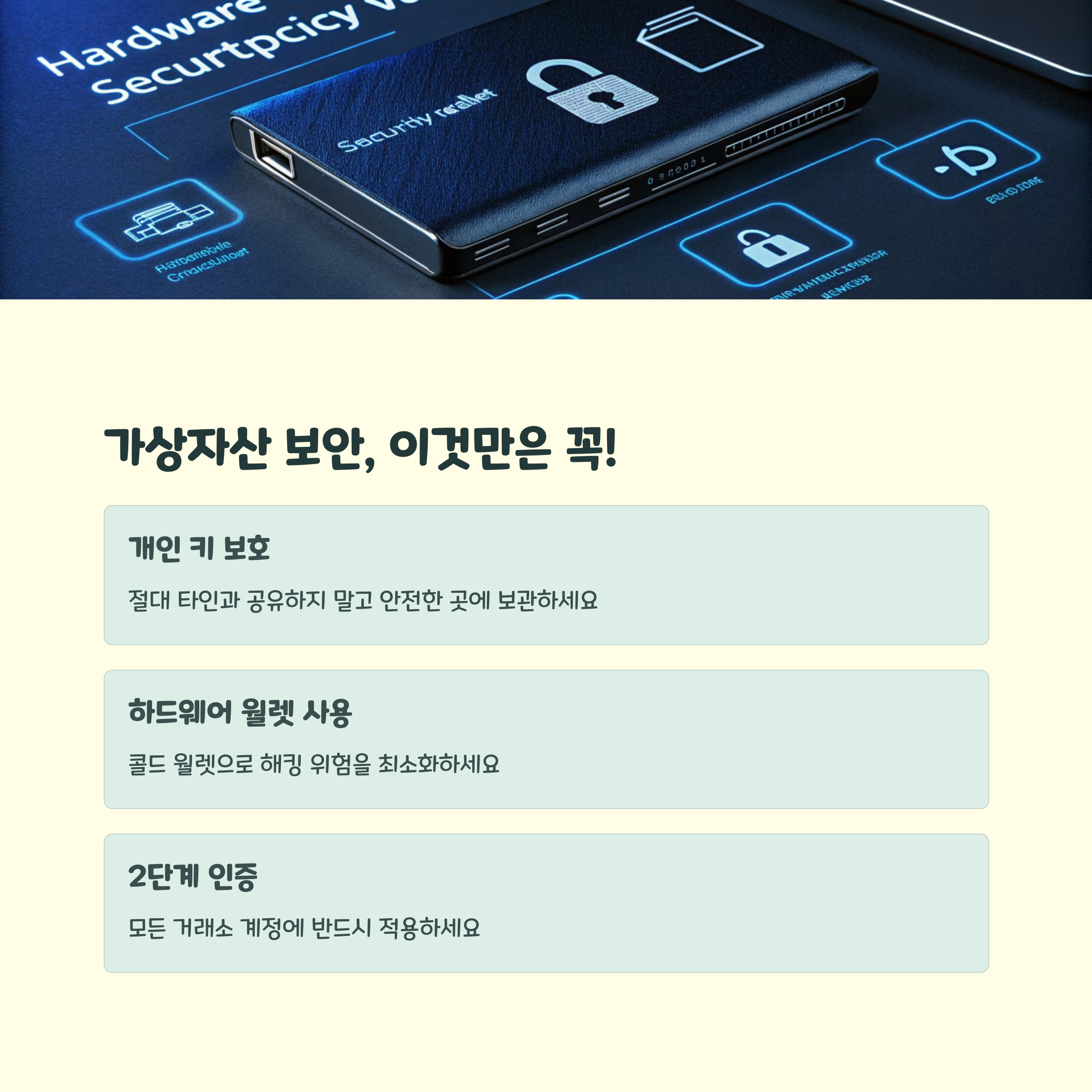 가상자산 투자의 가장 큰 리스크 중 하나는 보안입니다. 해킹, 피싱, 거래소 파산 등 다양한 문제가 발생할 수 있으므로 하드월렛, 2차 인증, 공식 사이트만 사용 등 기본 보안 수칙을 철저히 지켜야 합니다.