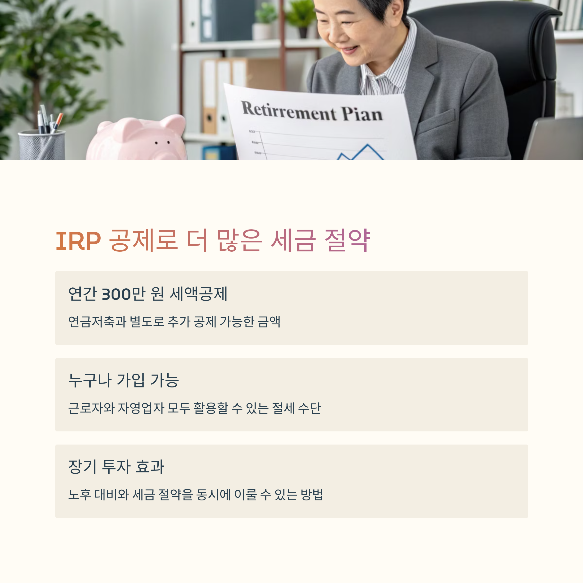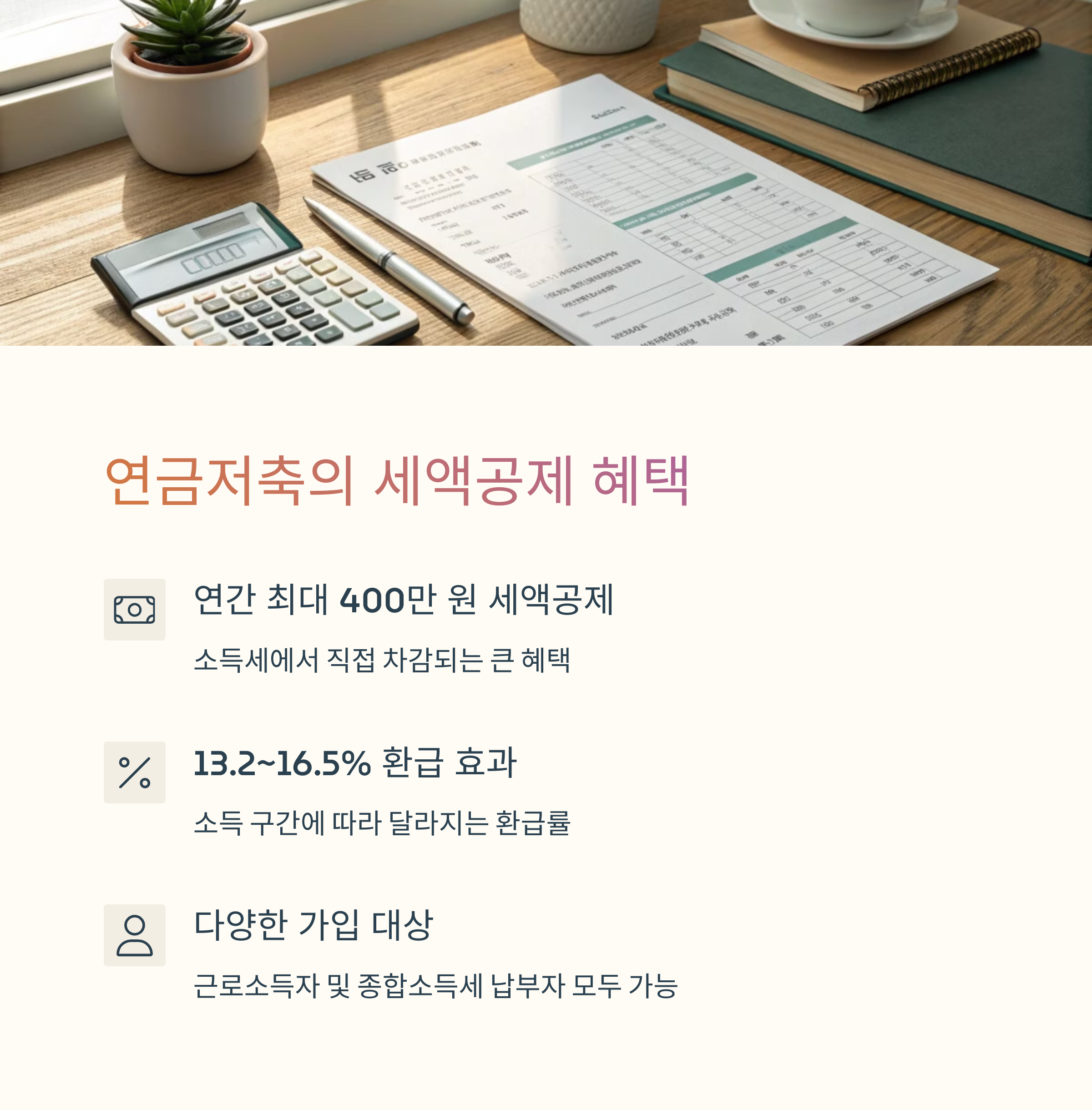 | 연금저축 400만 + IRP 300만 | 고소득자는 공제율 감소 | 자동이체로 습관화 유도 |