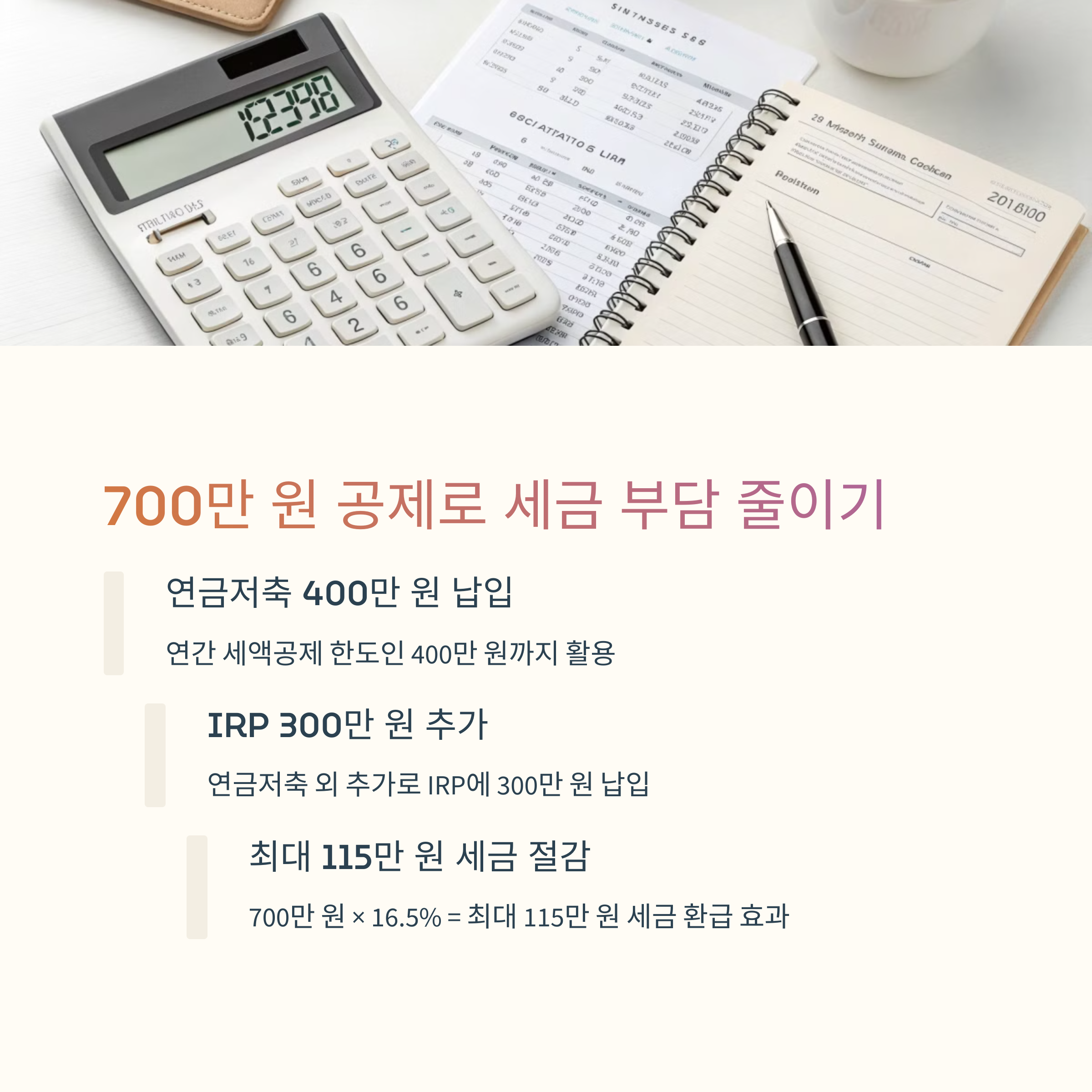 | 연금저축 400만 + IRP 300만 | 고소득자는 공제율 감소 | 자동이체로 습관화 유도 |