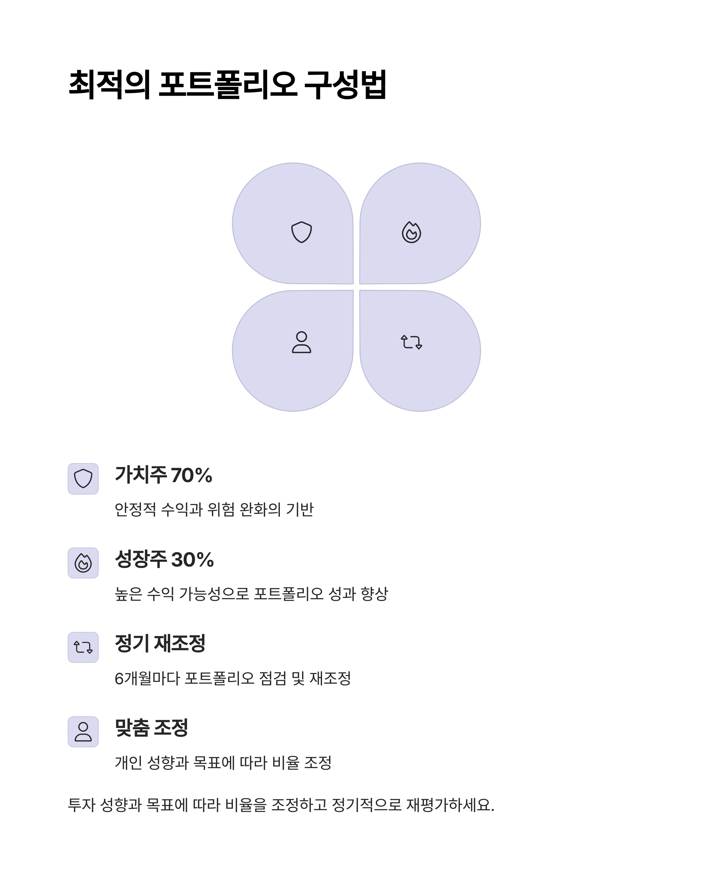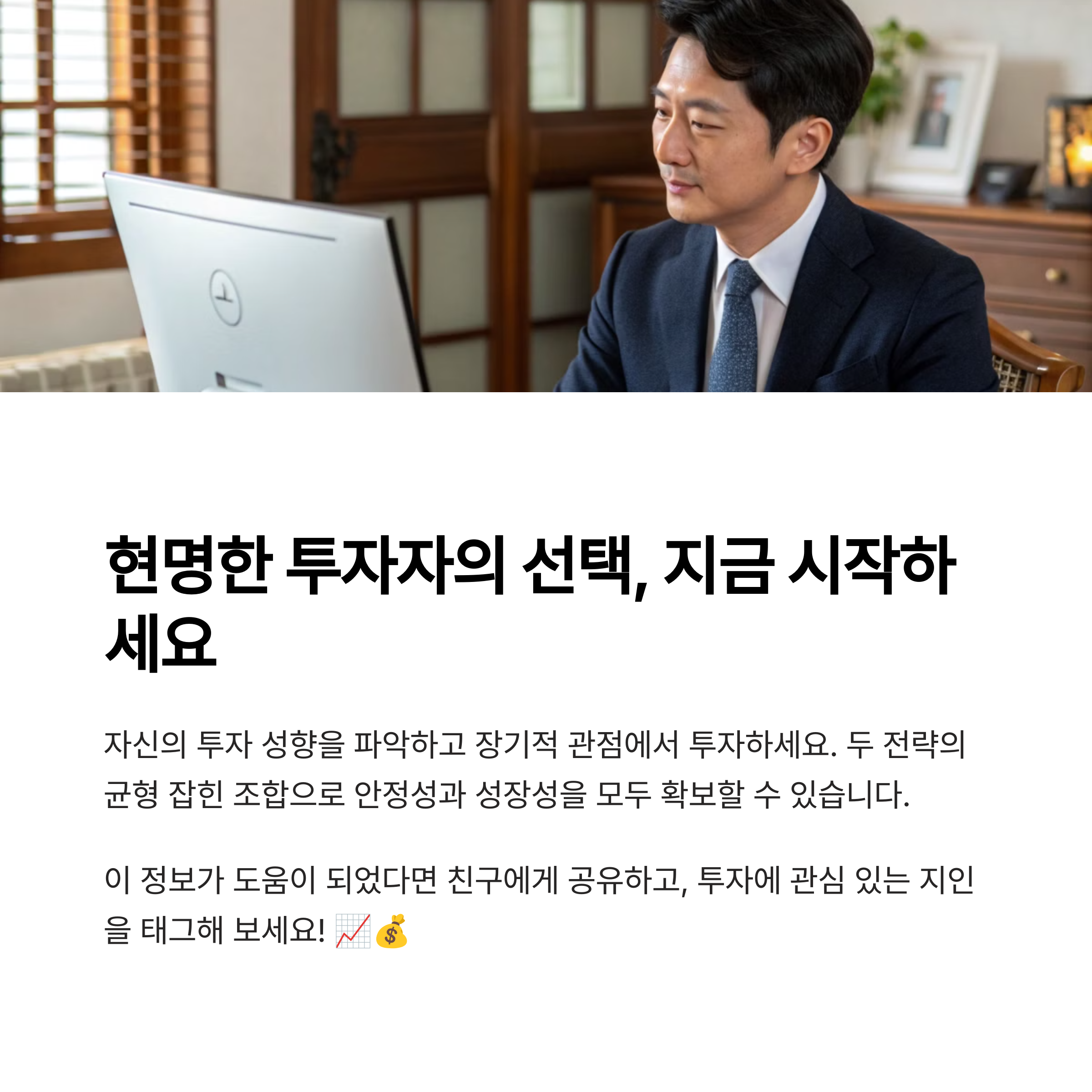 | 배당 수익과 장기 보유 전략에 유리 | 단기 수익 가능성은 크나 리스크도 큼 | 초보는 7:3 또는 6:4 비중으로 시작 추천 |