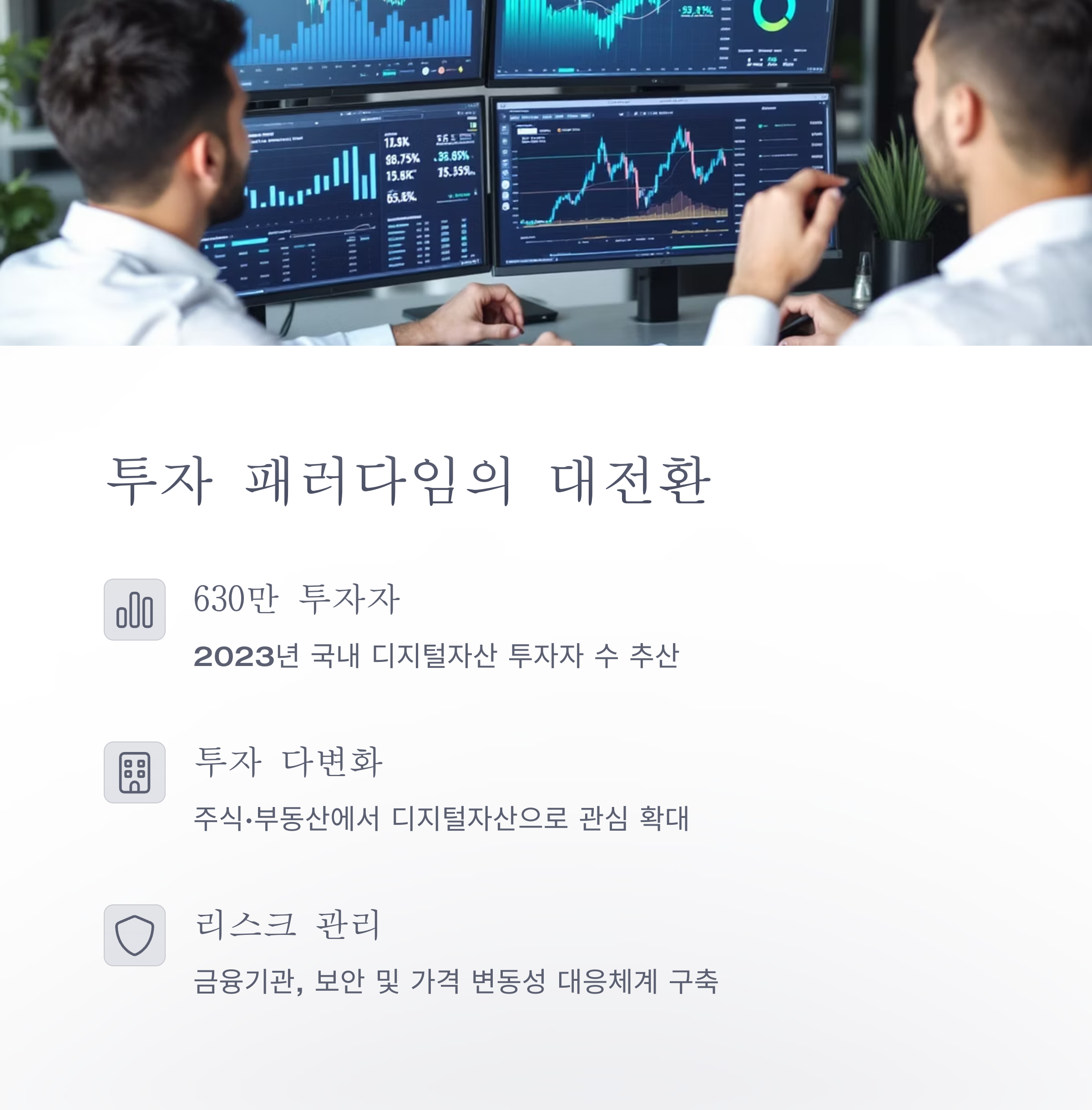 | 자산 분산 투자 확대 | 주식, 부동산 외에 가상자산 투자 수요 급증 |