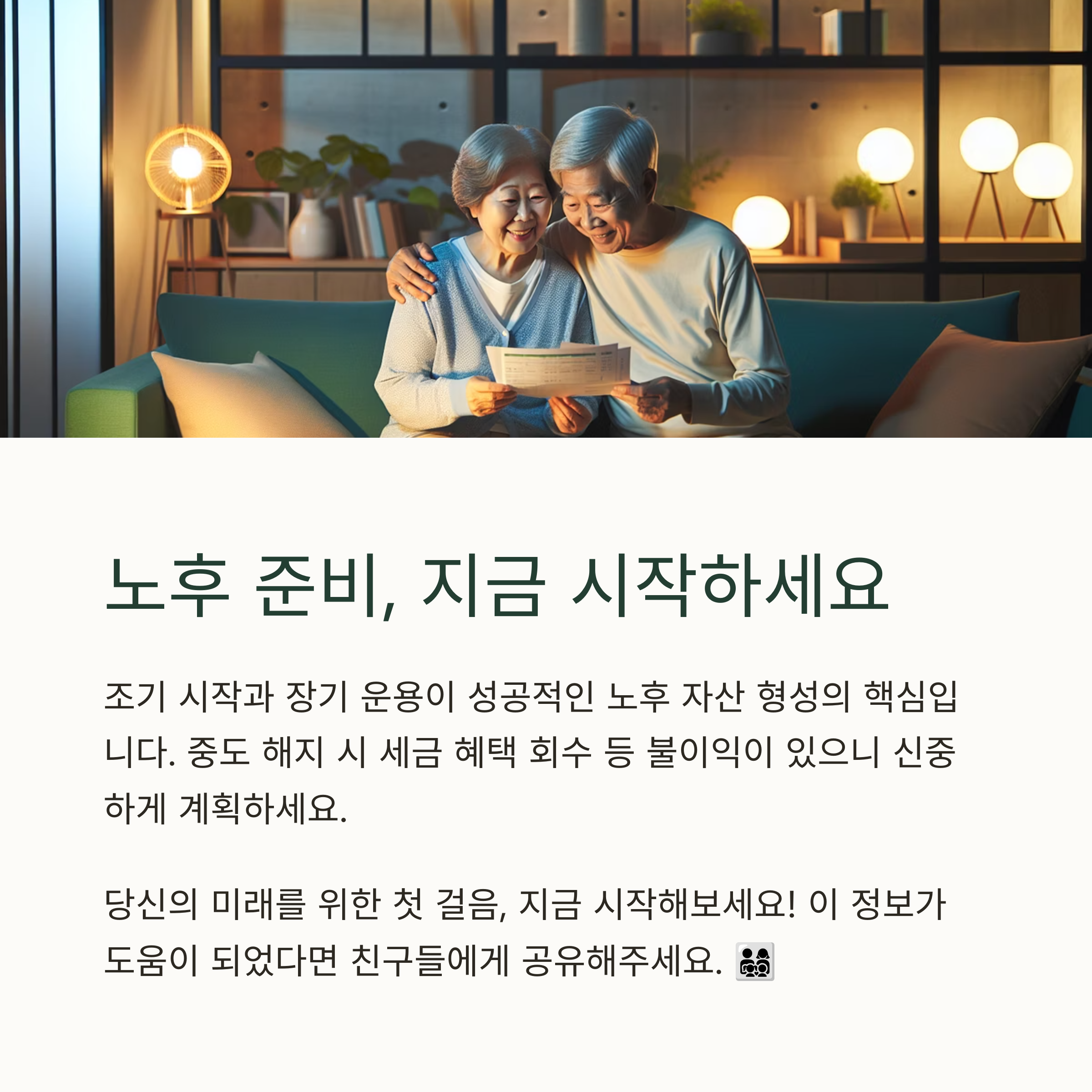 세제 혜택을 받으려면 55세 이후, 5년 이상 연금 형태로 수령하는 것이 좋아요. 너무 이른 해지는 손해입니다.