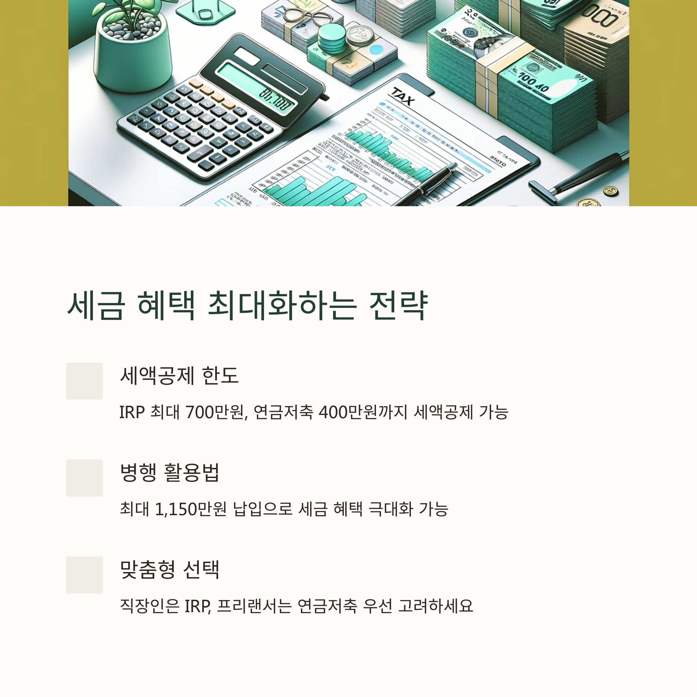 직장인이라면 보통 IRP와 연금저축을 병행하는 게 좋다고 해요. 왜냐면 세액공제 한도는 합산 기준이기 때문에, IRP에 300만 원, 연금저축에 400만 원 식으로 나눠서 가입하면 가장 효율적이거든요. 반면 자영업자나 프리랜서라면 연금저축을 먼저 챙기고, 여유가 생기면 IRP까지 고려해도 충분해요. IRP는 퇴직금 수령 계좌로도 쓰이는 만큼, '직장인 + 퇴직금 수령 예정'이라는 조합이라면 IRP는 필수템!