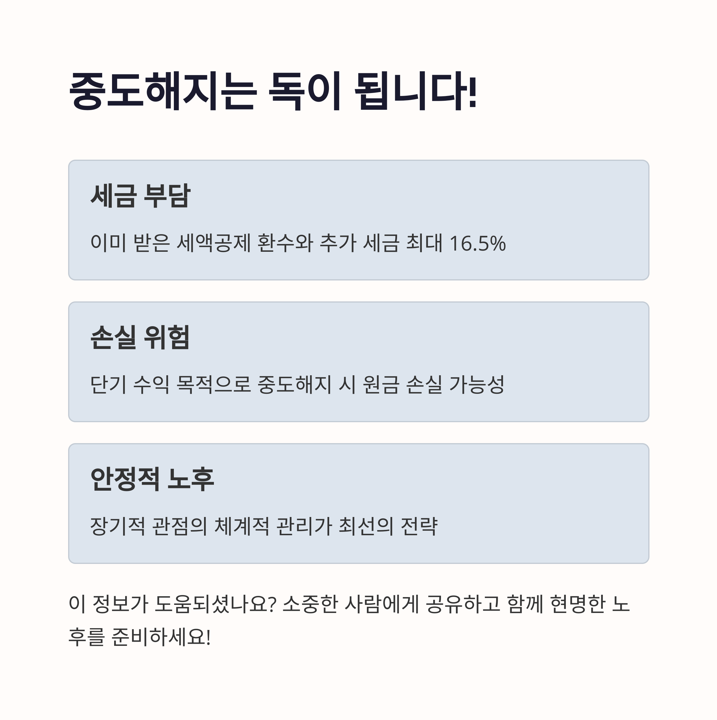 세액공제만 받고 중도 해지하면 큰 불이익이 발생할 수 있습니다. 긴 호흡으로 노후 자산을 준비하는 관점에서 IRP를 활용해야 합니다.