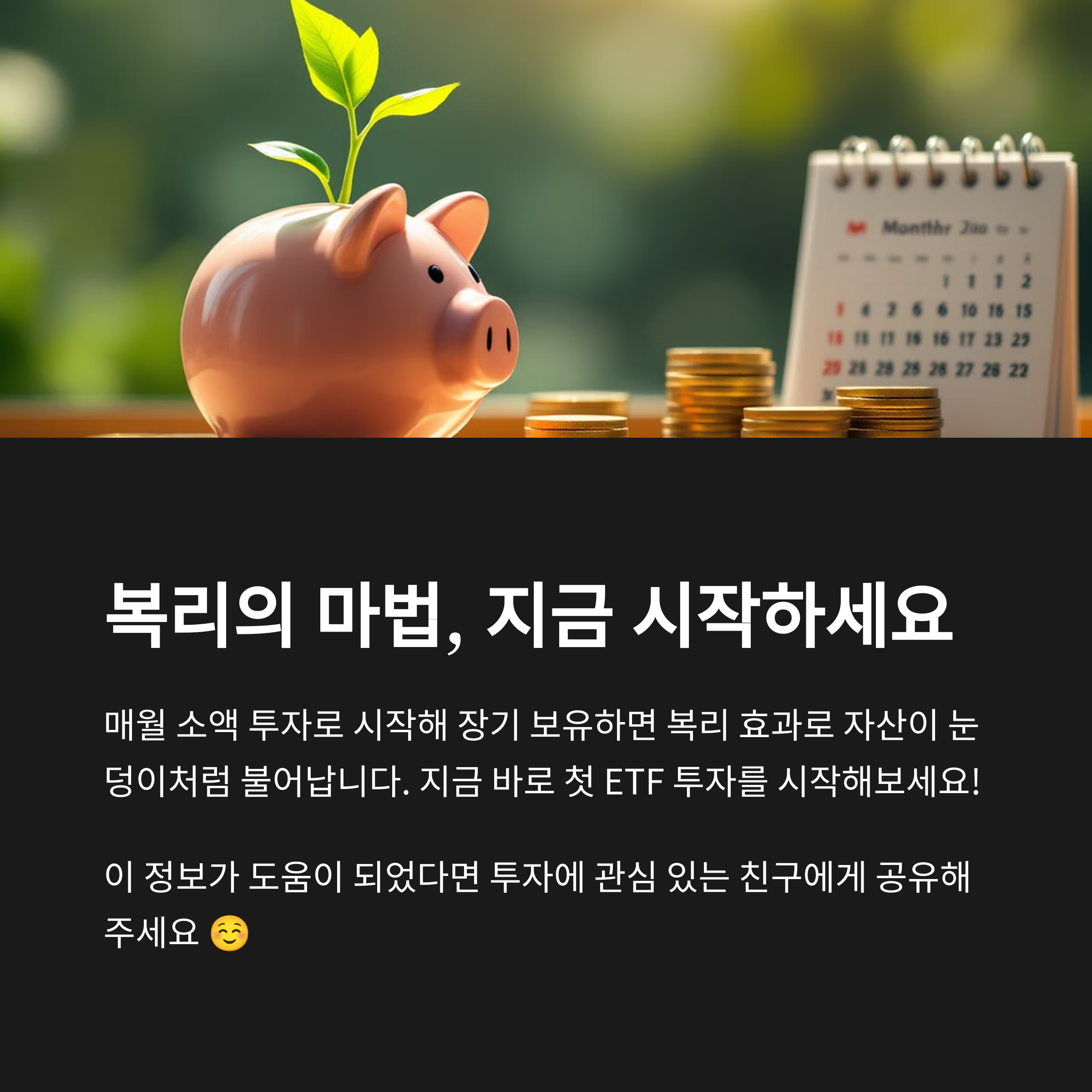 인덱스 ETF는 초보자에게 최적화된 투자 수단입니다. 복잡한 분석 없이도 분산 효과를 누릴 수 있고, 적립식으로 장기 보유하면 복리 효과도 기대할 수 있습니다. 시장 전체에 투자하는 안정성과 효율성을 겸비한 인덱스 ETF, 오늘부터 하나씩 매수해 보세요!