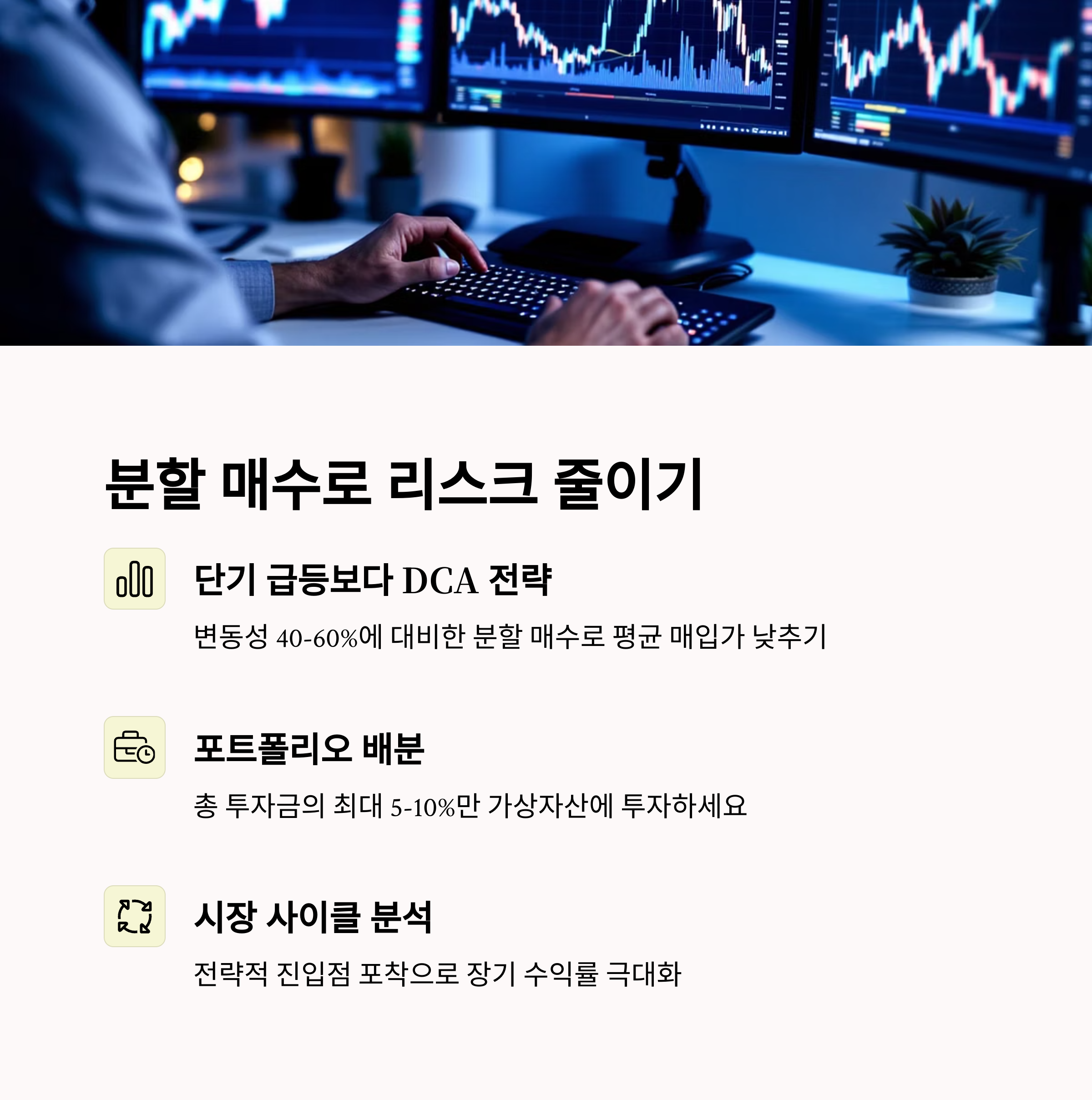 지금처럼 방향성이 명확하지 않은 시기에는 전액 진입보다 분할 매수가 바람직합니다. DCA(Dollar Cost Averaging)를 활용한 일정 금액 정기 투자 전략이 유효합니다.