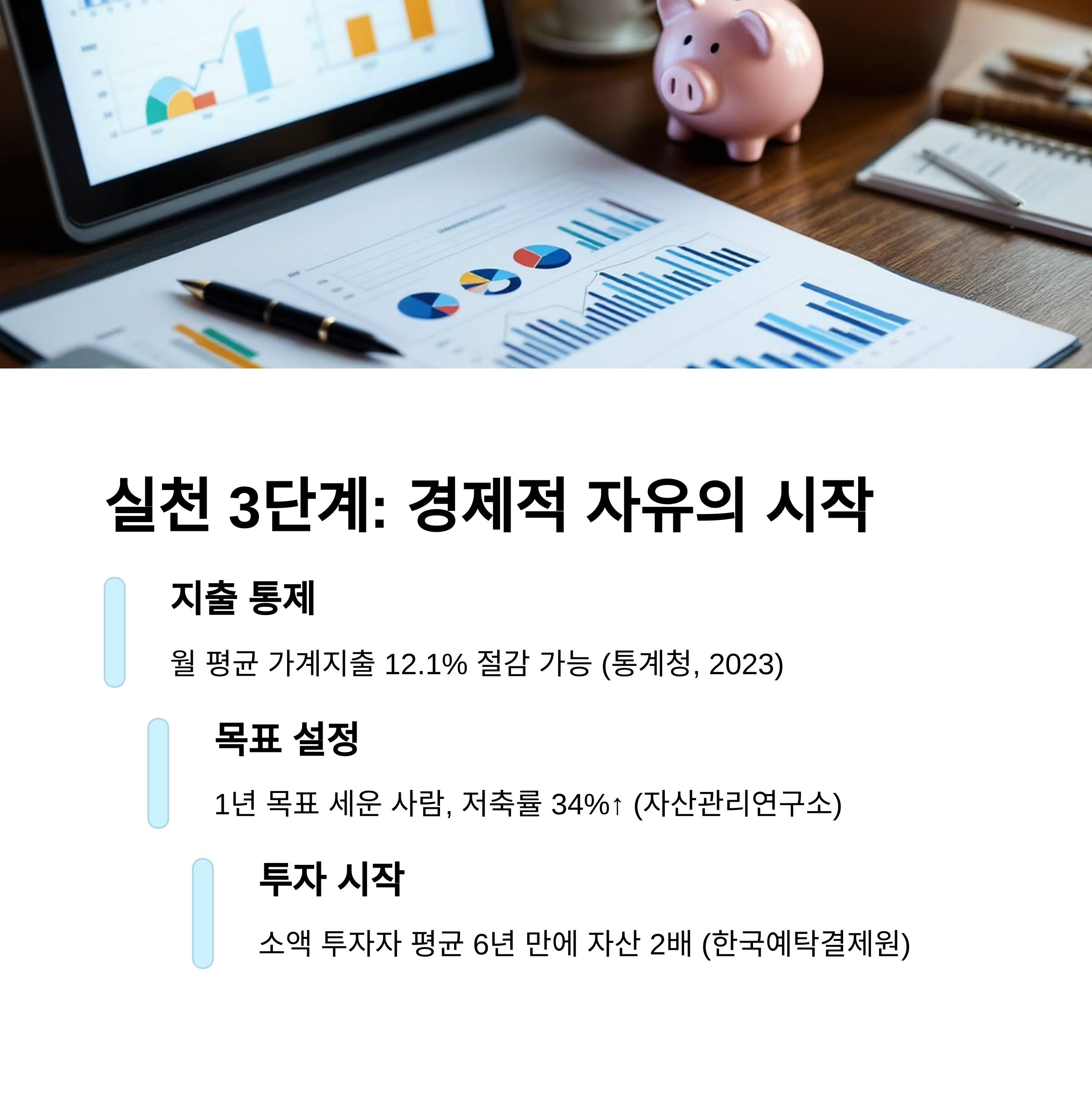 1) 지출 내역 기록부터 시작하세요. 2) 매달 자산 흐름 파악. 3) 금융 앱 활용해 자동화. 4) 비상금 마련 후 소액 투자 개시. 작지만 지속적인 실천이 핵심입니다.